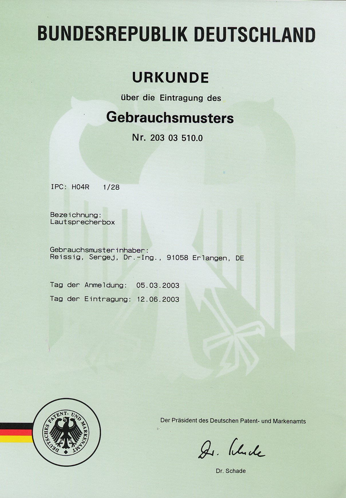 die Eintragung des Gebrauchsmusters der Lautsprecherbox