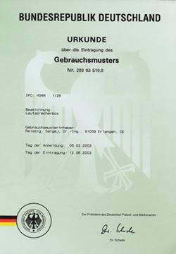 Urkunde zum Gebrauchsmuster "Lautsprecherbox" |